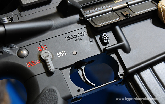 両側から操作可能なアンビセフティはギアで連結されている。そのためにグリップ側にギアパーツが影響し、次世代電動M4シリーズとのグリップパーツ互換性はないとのこと。