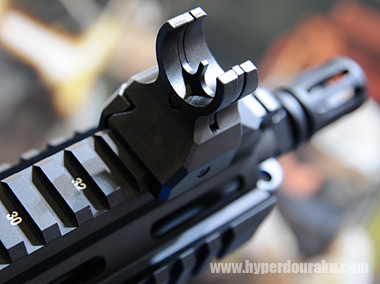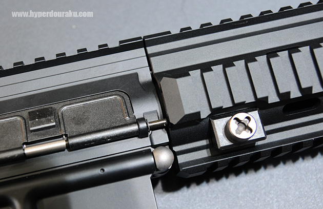 トップレールにはレールガイドナンバーがレーザー刻印されている。アッパーレシーバーと噛み合ったレールハンドガードが比類無き剛性感を生み出す。また命中精度もレシーライフル並に良いとのこと。
