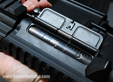 チャージングハンドルを引けば連動してボルトキャリアが後退、バレル同軸式の可変ホップアップの調節ダイヤルが現れるのはM4と同じ。