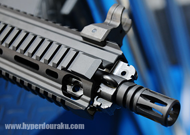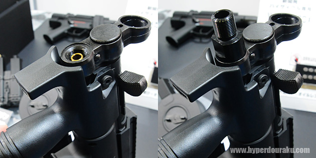 従来のMP5Kは基本的にサイレンサーを装着することが出来ず、サードパーティー製のマズル変換アタッチメントが必要だったが、今回のMP5K HCではアルミ削り出しのマズルアダプターが標準装備されたことで、M14逆ネジ対応の各種サイレンサーが簡単に取り付けられる様になった。