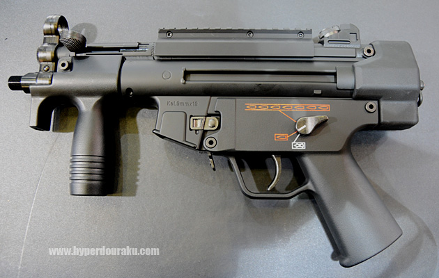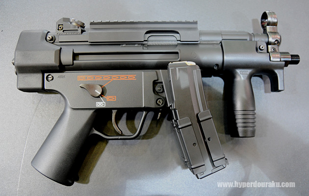 MP5K HC。最小・最軽量のハイサイクル電動ガンを目指して開発された。アルミ削り出しマズルアダプター、樹脂製レシーバーエンドキャップで軽量化。平タイプのヒューズと後方配線でAKバッテリーの交換が楽。