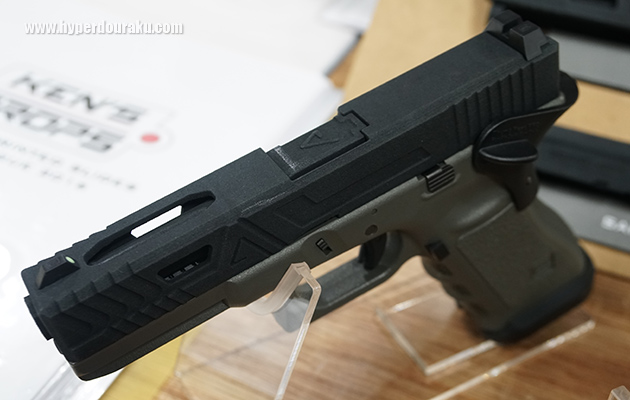 SOMETHING TACTICALブースではさらに、KEN'S PROPSという3Dプリンターによる樹脂製のガスブロハンドガン用カスタムスライドを展示していた。ポリアミド12と呼ばれる粉末のナイロン素材をレーザーで固めたプラスチック製で、ABS樹脂よりも軽く、弾力性に富むという。