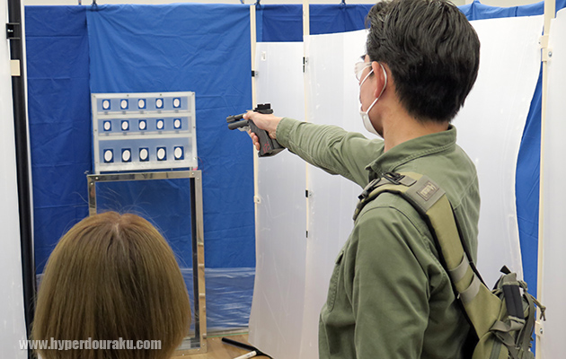 赤羽のフロンティアにはマック界さんと上矢ゆいさんがシューティングレンジを設置し、APSカップの体験射撃を開催していました。