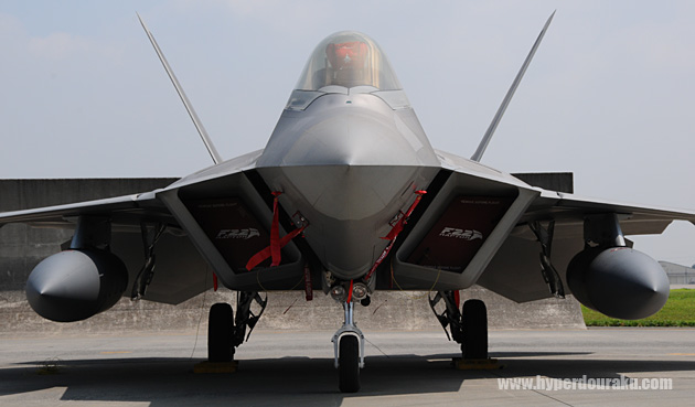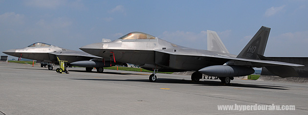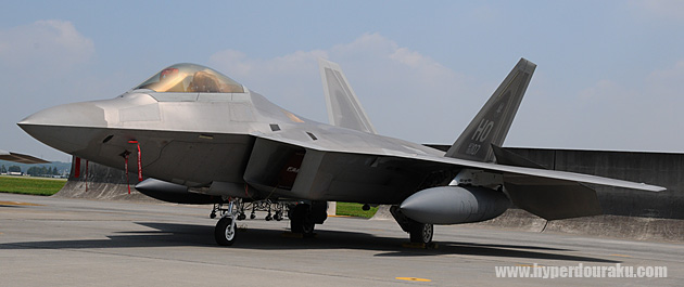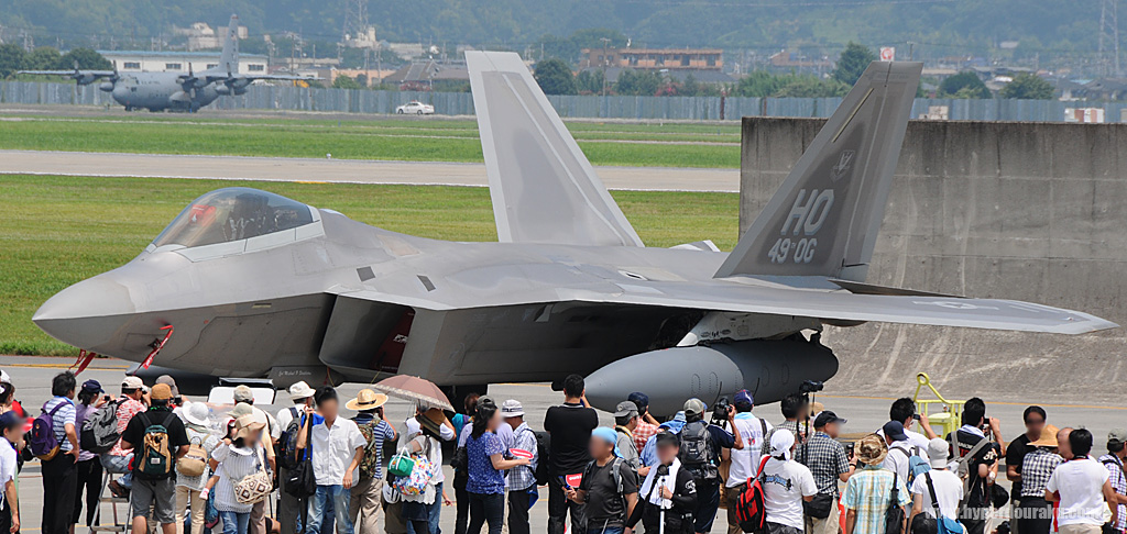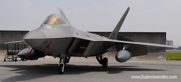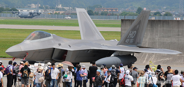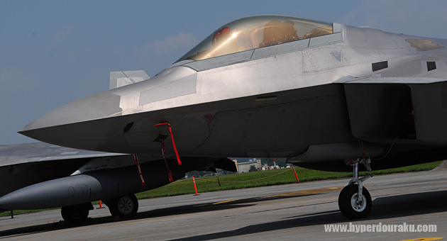 まずは去年も飛来した米空軍が誇る最新鋭ステルス戦闘機、F-22ラプターが今年も展示された。