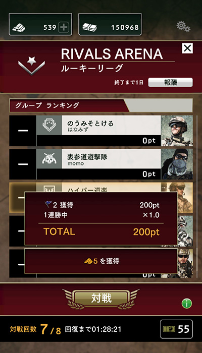戦闘に勝てばポイントが貰え、連勝すればポイント倍率が増加する。また同時にゴールドも貰える場合がある。仮に戦闘に負けてしまっても、リトライすることができ、その場合、敵の動きは変わらないので、その動きを読んで指示を出せば有利に戦闘が展開するだろう。ただし、対戦できる回数には限りがあり、何度もリトライすれば対戦チケットが減っていくので、どうしても勝てない相手にいつまでも挑戦し続けず、確実に勝てる相手を選択するのも決断力といえる。