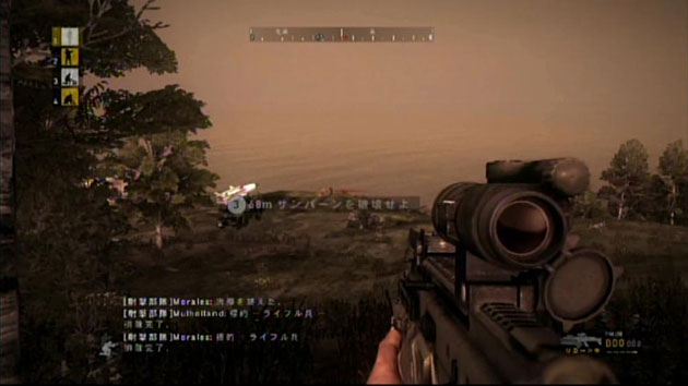 交戦距離は200m。ドットサイトでは敵が豆粒にしか見えないが、使用するアサルトライフルはSCAR-Hの7.62mm。弾道は低進し、よく当たる。敵は小口径5.8mmの95式自動歩槍なので威力ではこちらが有利。