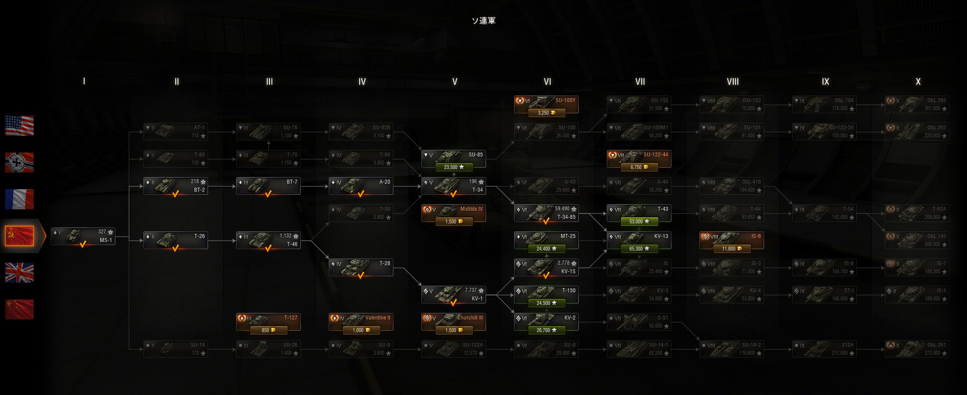 技術ツリーまずはどの国の戦車を使うか悩ましいところ。しばらく遊んでみてYASはドイツ戦車と迷った挙句、ソ連の戦車をメインに使ってみることにした。T-34とか乗ってみたいしね。