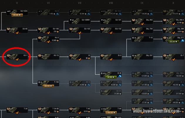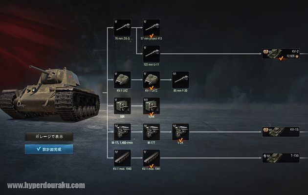 研究画面では様々なパーツを開発していく必要がありますが、ここからソ連の強力な重戦車ツリーが始まっていきます。ティア6へ進む場合、KV-1S、IS戦車へと続く開発ルートがおすすめです。