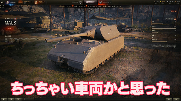 こちらもスーパーどデカい超重戦車のマウス!! こんな計画や試作だけで生産されなかった戦車もWoTなら操れちゃうのだ。ちなみに計画段階で敵国にバレないように、大きな戦車なんだけどあえて小さい名前を付けたんだ。