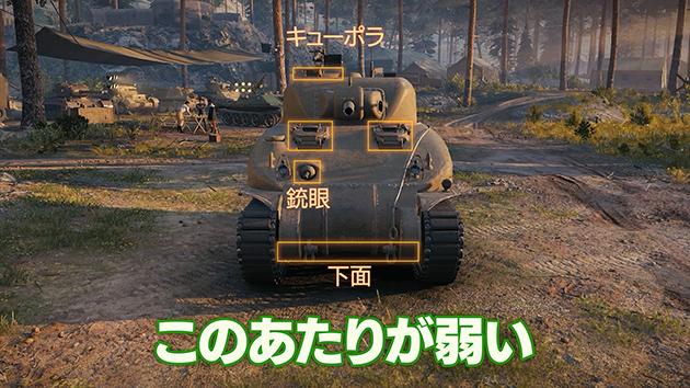 また戦車は観測用の窓であるキューポラや、銃眼、車体下側が走行が薄い傾向がある。こういった弱点を戦車ごとに把握して、積極的に狙っていこう。