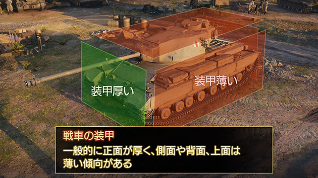 戦車の装甲は正面が厚い傾向があるので、真正面から撃ち合うのは効果的とは言えない。なるべく敵の側面や背面を撃つように心がけよう。