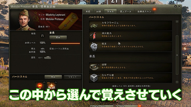 搭乗員にスキルを覚えさせると、戦車の操安性が向上したり、敵を発見しやすくなったりする。とくに車長の「第六感」は真っ先に覚えさせておきたい必須スキル。敵に発見されると3秒後に知らせてくれる。