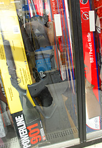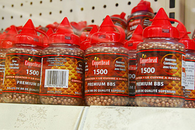 CO2ガンはこのような金属の弾を発射する。射程距離は200mを超えるそうなので日本には持ち込めないだろう。