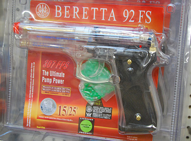 中国製のベレッタ92FS。コッキングエアソフトガン。240ピストルと書いてあるのは初速が240fpsという意味。となると大体80m/sなので、日本のエアソフトガンと同じパワー。
