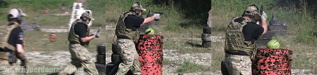 フランキ SPAS12。イタリアのルイジ・フランキ社が開発したコンバットショットガン。本来はポンプアクションと、セミオートマチックに切り替え可能だが、ポンプアクションのみでの射撃となった。一緒に撃ったレミントンM870と比べると、とにかくデカくて重い。