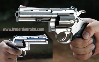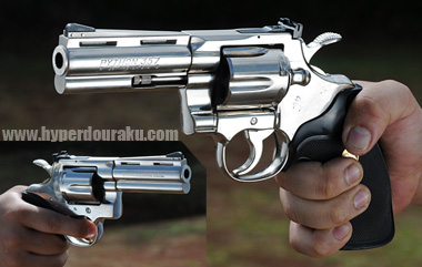 ニッケルメッキの4インチ。.357マグナム弾を使用。やはり自分的にはパイソンは4インチバレルが似合うと思う。