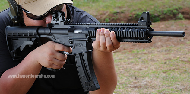 S&W M&P15-22。鈴木社長に「これ撃ってみる?」なんていわれて手渡されたのが、この銃。22口径は今米国本土で流行っているみたいだし、いっちょ撃っておこうということに。22口径は弾も安いしね。パシパシとWAのM4よりリコイルがライト。撃ちやすくてトレーニングには最適。