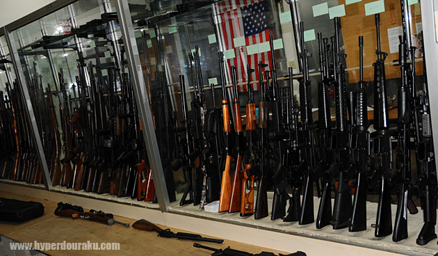 ワールドガンのオフィスにはもう紹介しきれないほどの銃器が並ぶ。
