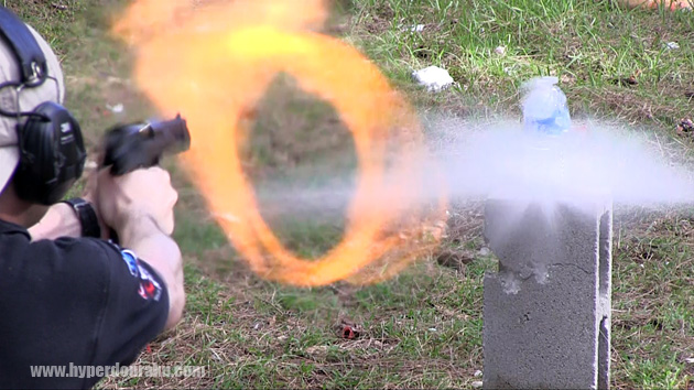 .50AE弾特有のファイアリング。昼間の屋外でも映像に捉えることができる。