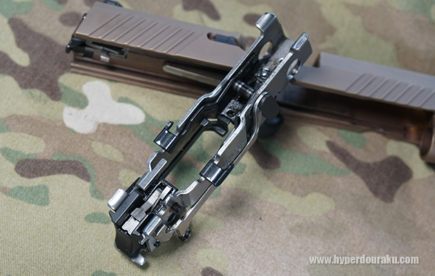 通常分解。このように、樹脂製のフレームからトリガーグループを取り外すことができるのが特徴。