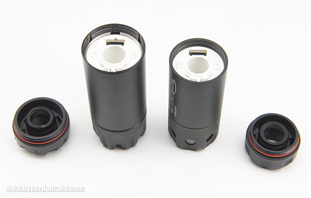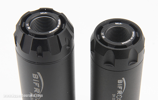 取付部はどちらもM14逆ネジ仕様。付属のM11正ネジ変換コネクターを付ければハンドガンなどにも取付できる。