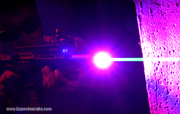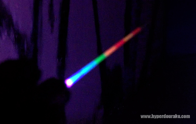 さらに面白いのが、トレーサー機能をオフにすれば、白いBB弾にマズルフラッシュの光を投影することができる。銃口から数十センチだが、7色に光る弾の光跡が見える。もちろん単色設定や、指定カラー順に設定して光らすこともできる。