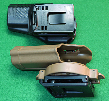 これら樹脂製ホルスターの最大の特徴は、先に述べましたようにメインアーム(プライマリィウエポン)からサイドアーム(セカンダリィウエポン)へ、またその逆を行なった際にハンドガンを素早く抜け、そして簡単にホルスターに戻す事が可能な点です。