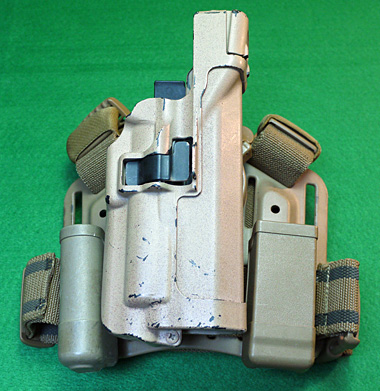 ブラックホーク製CQC SERPAロックホルスターはプラットフォームを変更する事でサイ(腿)ホルスターにも変更可能。(画像はロック機構が2重となっているLEVEL3、ブラックホーク製ライト サイフォスが取り付けられたGlock20/21が収納可能)