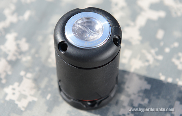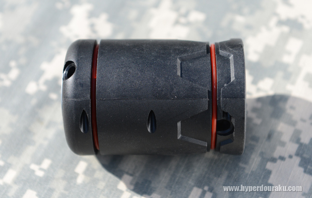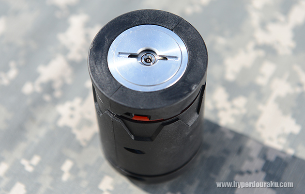 重量は328g、全高85mm、直径57mmの円筒形で、重量は327g。この標準スキンには上部に3つ、下部に3つの6つのBB弾射出孔があり、ここからローダーで弾を装填する。
