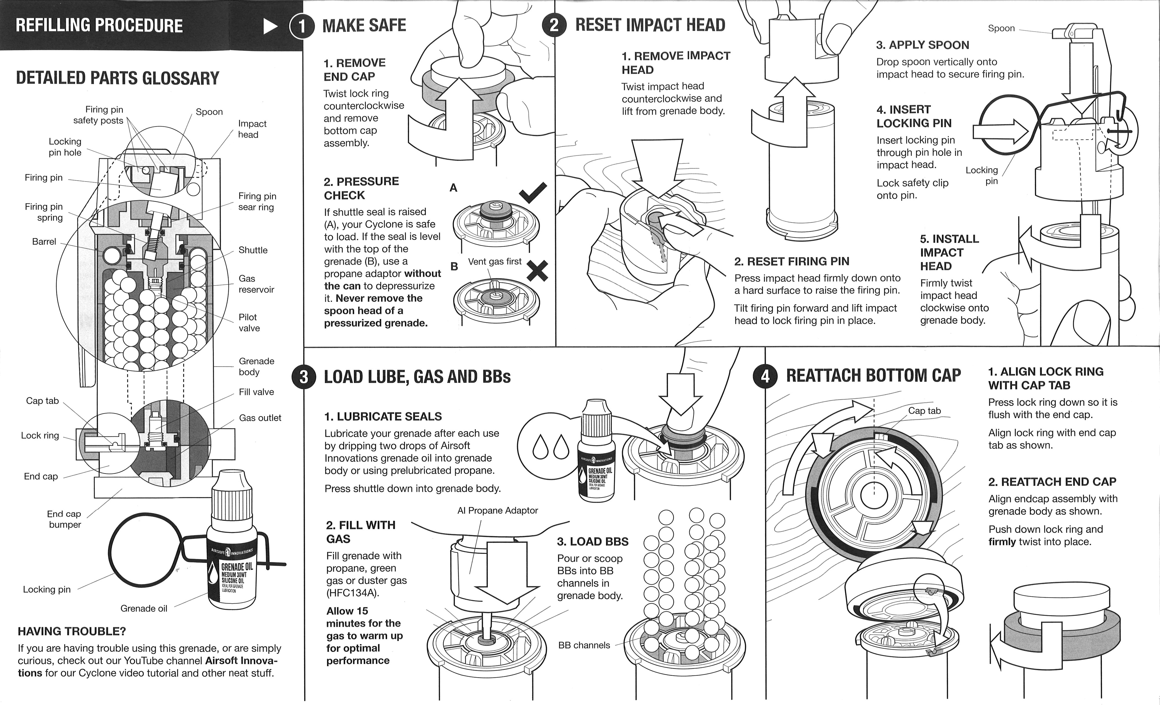 本体にもCYCLONEの装填方法が英語ですが、明記されています。 装填するのに専用の工具も必要もなく、手順さえ覚えれば、1分以内に再装填できるようになります。