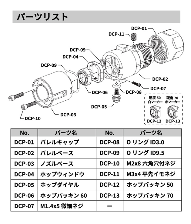 パッキン硬度はショアA50 / 60 / 70を付属し、気温やBB弾重量に合わせた硬度セッティングが容易です。