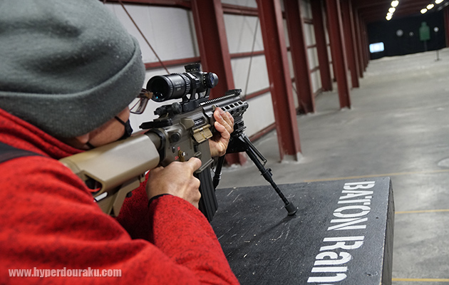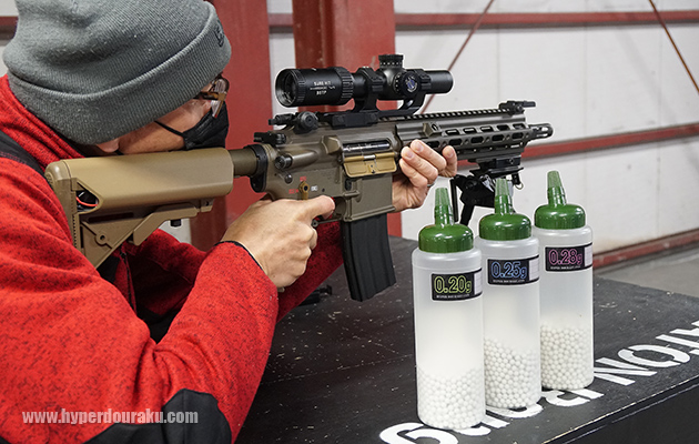 さっそく埼玉県所沢市の屋内シューティングレンジ、BATONレンジ1Fのロングレンジに、HitCallバイオBB弾とテスト用ライフルの東京マルイ次世代電動ガン「HK416 デルタカスタム」を持ち込んだ。エアガン本体はメーカー出荷状態そのままの完全ノーマル品。バイポッドで射撃ベンチに委託し、正確に標的の中心を狙うためNoverArms製のスコープ「SUREHIT1824」を純正マウントで搭載してある。またサバイバルゲームにおけるリアルな使用状況を考え、付属のロッドを使った簡単なバレルクリーニングを最初に行なったのみで、途中クリーニングは一切せずに射撃を行った。