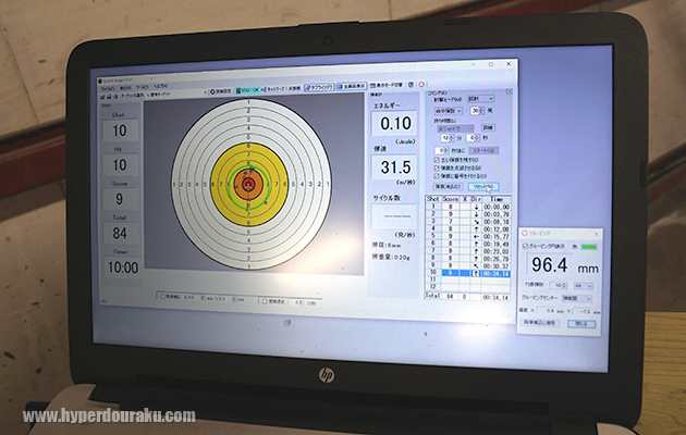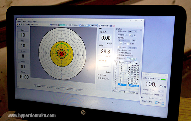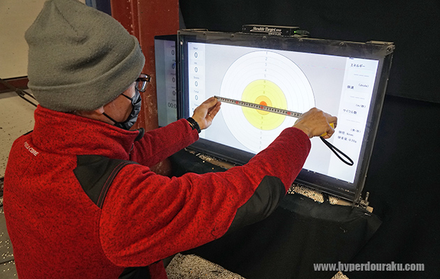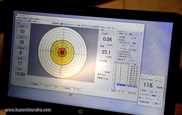 モニター画面には一番遠い弾痕同士の距離(=グルーピング)が表示されている。注目は着弾時の弾速「25.1m/秒」。初速「83〜88m/秒」前後で射出されたものが25m飛翔した結果、弾速は30%程度になっている。BB弾は重量が軽いほど空気抵抗の影響を受けるので、0.20g弾よりも0.25g弾の方が、更に0.28g弾の方が遠距離での弾速は保たれる。