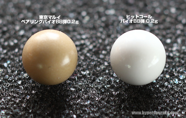 「東京マルイ/ベアリングバイオBB弾0.2g(左)」との比較。ここまで拡大するとBB 弾表面の粒状も目立つものだが、HitCall(右)の表面はより滑らかなのが判る。
