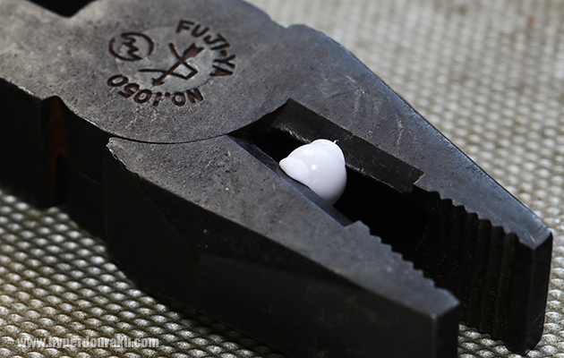 BB弾を割るためにペンチに挟んでいるところ。特に0.20gBB 弾にはこのようにかなりの粘りがあり、簡単には割れなかった。メッシュゴーグルへの着弾時に砕け散って眼球に傷を負わせることが無いよう、HItCallには「粘り気を出すための鉱物」が配合されているそうだ。