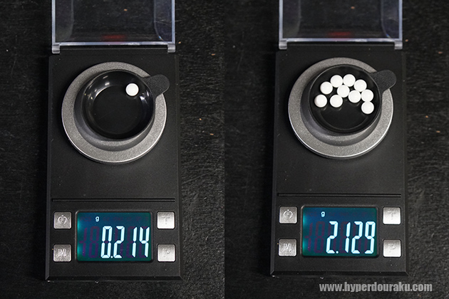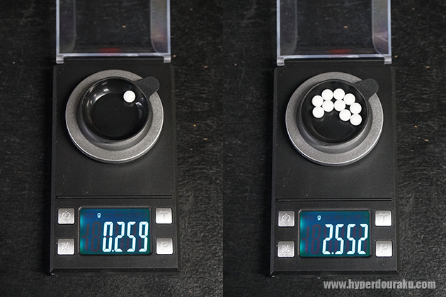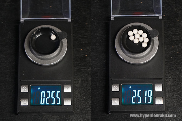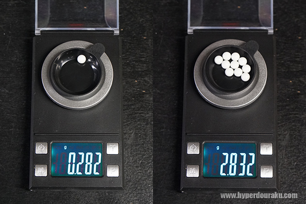 精密系シューティングマッチに活動の軸足を置いている筆者にとって0.28gBB 弾は最重要アイテムなのでテストにも一際気合が入る(笑)。様々なテストを経て現在筆者が最も優秀だと思って使用している某ブランド製バイオBB弾(左)とHitCal(右)。表面の艶ツヤ感がこんなに違うとは。