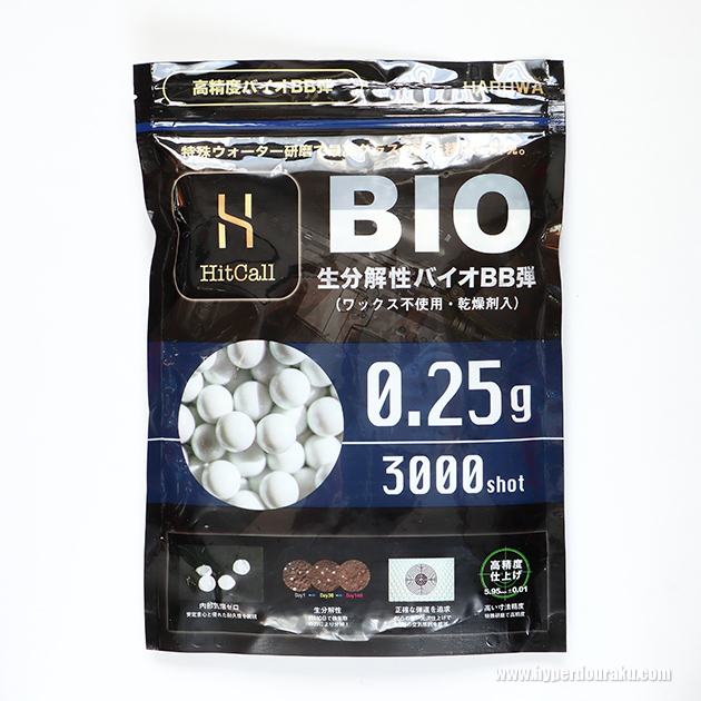 屋外など遠距離での精度を求めたい場合に使用することが多い0.25gバイオBB弾もHitCallはラインナップしている。こちらも1kg=3,000発入り大袋での販売となる。