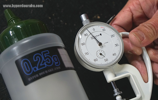 「東京マルイ/ベアリングバイオBB弾0.25g」も実測してみた。「ヘア・マイクロキャリブレーター」では「5.945mm」。無作為の10発、更に1発毎に挟む箇所を数回変えての実測値は「5.943〜5.947mm」だった。
