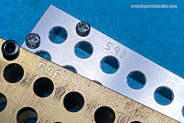蔵前工房舎製のBB弾ゲージ。今回も「5.98mm」と「5.96mm」の2種類を用意し、0.20g、0.25g、0.28g共に10回分=1,000発を通してみた。5.98mmゲージは全弾が通過。ちなみに低温時の金属収縮を避けるため5.96mmの選別は室温20℃の部屋で実施し、100発選別する毎にマイクロファイバークロスでゲージを丁寧に拭く事も忘れなかった。