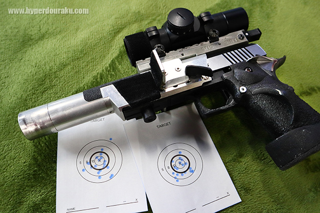 ガスブローバックによる精密射撃競技JANPSにはHitCall 0.28gが抜群の適性を見せてくれた。距離8m、各20発。筆者が従来から使用している某ブランド製0.28gバイオBB弾(左)とHitCall 0.28g(右)の差は歴然だ。因みにこの銃のベースは「東京マルイ/ハイキャパ4.3」で、ノンHOPインナーバレル「ファイヤーフライ製/はみけつ6インチ」を使用している。