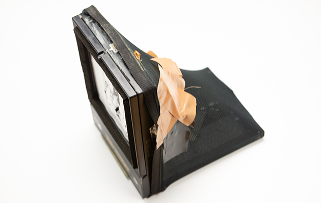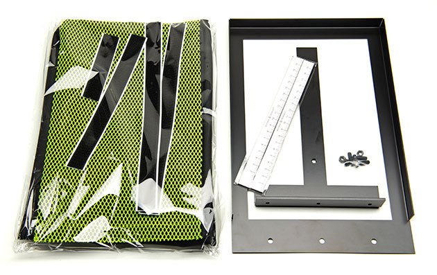 フレームとベースパーツをネジ3本で固定し、フレーム外周に面ファスナーを貼って弾受けをスチールフレームに固定します。