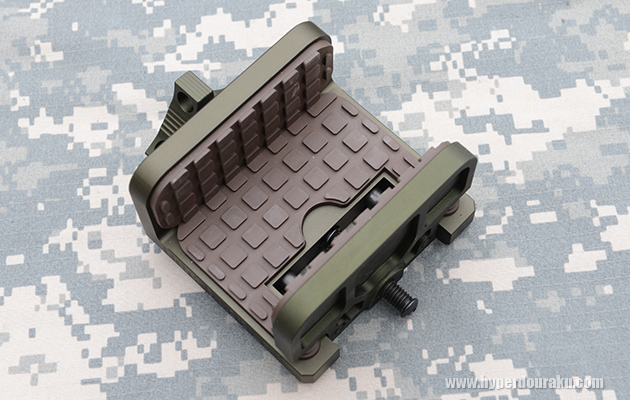 本体はCNC削り出しのアルミ製で万力のような形状。内側にはゴムが張り付けられてガッチリと銃を固定できるようになっている。