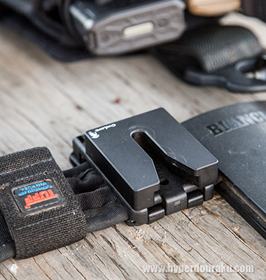 ベースアタッチメントはテックロックにも取り付け可能。より省スペースでベルトに取り付けられる。この拡張性こそがマジッククリップの魅力だ。