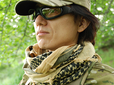 アラブスカーフ、いわゆる「シュマグ」を巻いて首から頬にかけてガードを高める。