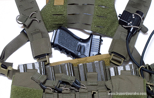 IWBホルスターを内蔵し、ハンドガンを入れるとこのようになります。これをチェストリグに挟み込みます。基本はこれで準備OKです。