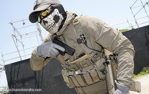 戦闘中、ライフルが弾切れ、もしくはトラブルの場合、素早くハンドガンに持ち替えて戦闘を続けたい時、ライフルを構えている手は、腰のホルスターより、胸にあるハンドガンの方が断然、早く手が届きます。