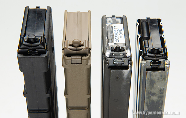 手持ちのトレポン用マガジンを比較してみる。PTS製とQMAGは中身も独自のものが採用されている。ZSHOTはシステマ純正が使用されている。現在のシステマ純正マガジンは透明樹脂製となっている。