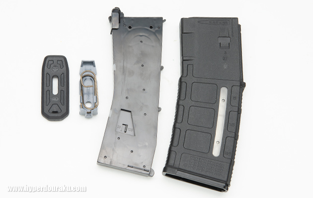 ボトムプレートを取りはずさなくても上側から中身を引き抜ける。ただケースの弾力で内部パーツが保持されているのでプレートをはずして下から押すと中身を取り出しやすい。装弾数は120発。