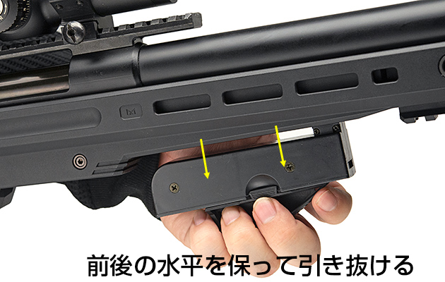 さらにマガジンを抜くとき!! これが格段にやりやすくなりました。ストックを保持している手の指先で、つまむのではなく、中指、薬指、小指を引っ掛けてスッと楽に抜けます!