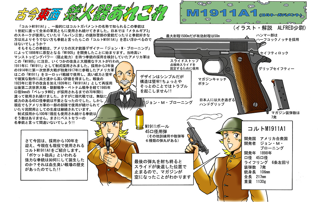そもそもこの拳銃は、アメリカの天才銃器デザイナー「ジョン・M・ブローニング」によって1898年に原型となる「M1905」を開発したことに始まります。当時高いマンストッピングパワー(阻止能力)を持つ拳銃の採用を検討していたアメリカ軍はこの「M1905」に注目、いくつかの改良と大規模なテストが行われ1911年に「M1911」として制式採用されました。